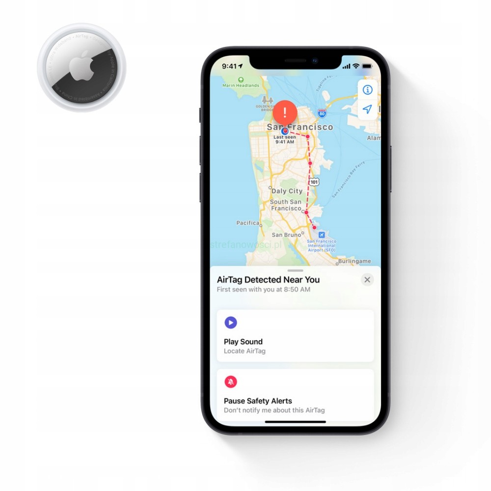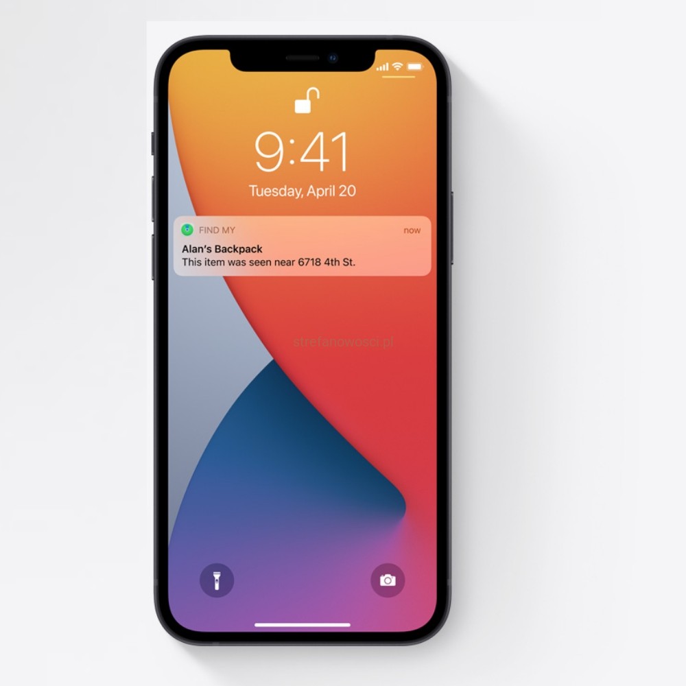 AirTag, podobnie jak inne urządzenia Apple, można przełączyć w tryb Utracony. I kiedy zostanie wykryty przez urządzenie należące do sieci, automatycznie dostaniesz powiadomienie. Możesz też skonfigurować go tak, żeby osoba, która go znajdzie, dostała Twoje dane kontaktowe po stuknięciu w AirTaga smartfonem z obsługą NFC. To ta sama technologia, która pozwala płacić za pomocą telefonu.
