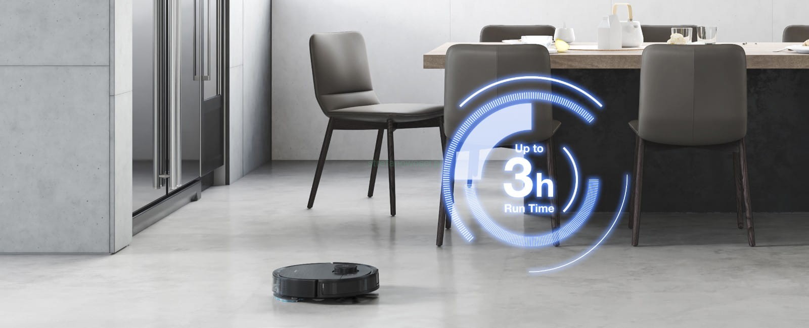 Na jednym ładowaniu odkurzacz może pracować aż 3 godziny, dzięki czemu robot może czyścić domy o powierzchni do 300m2, przy standardowej sile ssania. Rzeczywisty czas pracy może różnić się w zależności od różnych warunków mieszkaniowych.