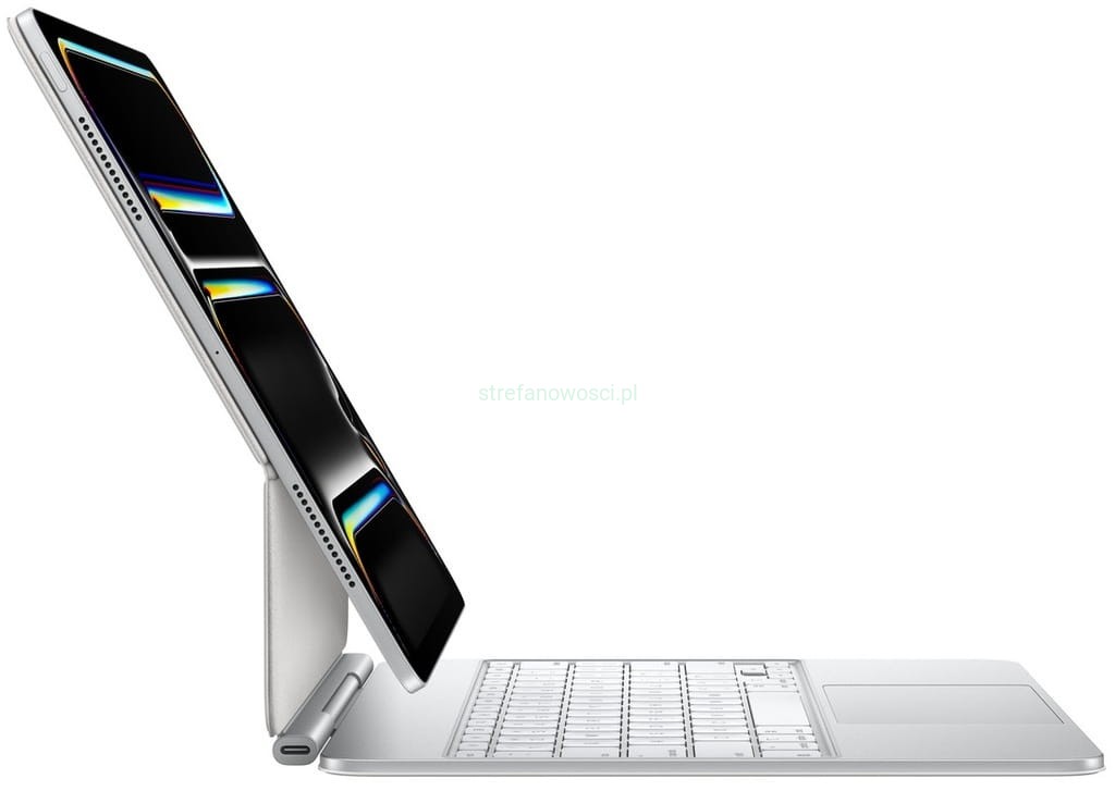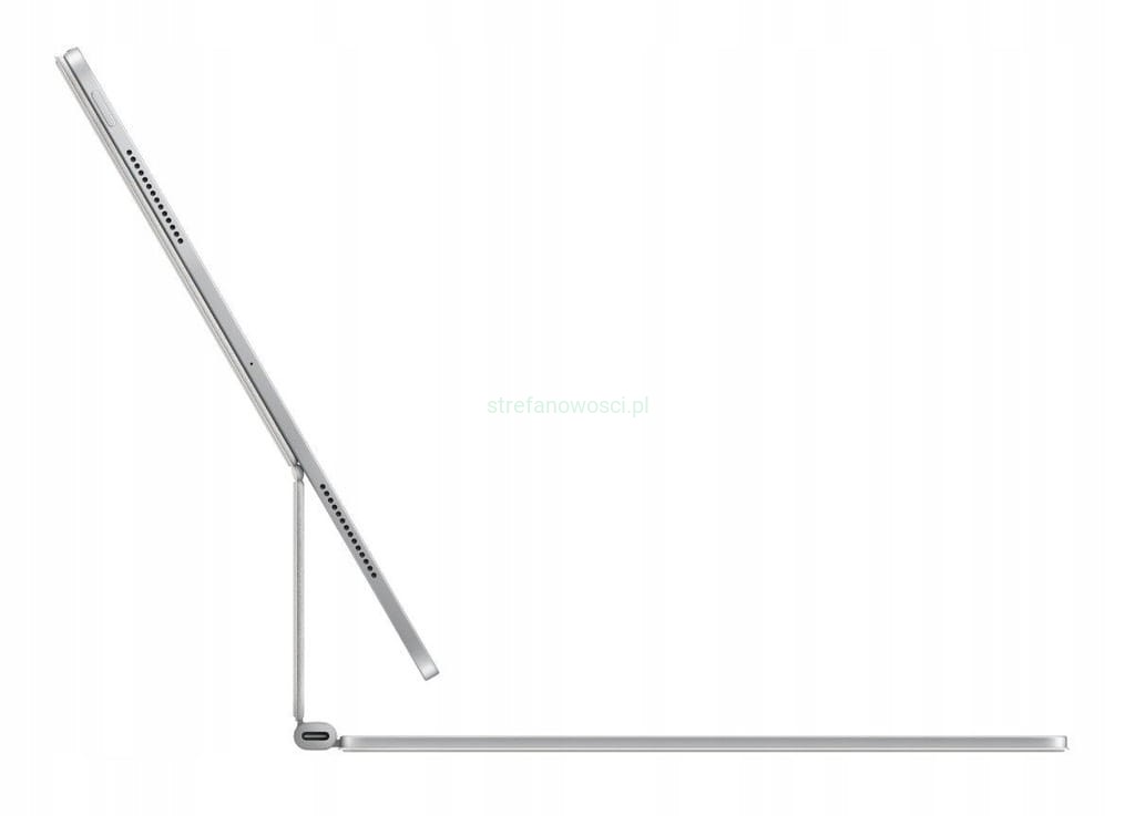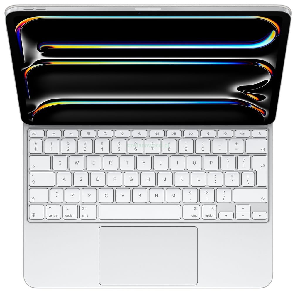 Klawiatura Apple Magic Keyboard do iPada Pro 13 cali (M4) - angielski (międzynarodowy) Biały Mwr43Z/A Magic Keyboard do iPada Pro to doskonałe rozwiązanie dla osób, które potrzebują mobilnego i funkcjonalnego sposobu na korzystanie z tabletu. Dzięki smukłej konstrukcji z obszerniejszym gładzikiem i klawiaturą z podświetlanymi klawiszami, można wygodnie pracować i tworzyć na ekranie iPada Pro. Dodatkowo, solidna obudowa zapewnia ochronę urządzenia podczas podróży. Zintegrowane rozwiązania, takie jak rząd klawiszy funkcyjnych i regulowany kąt nachylenia ekranu, sprawiają, że korzystanie z iPada Pro z Magic Keyboard staje się jeszcze bardziej komfortowe i efektywne. Korzyści: - Fantastyczne połączenie klawiatury i gładzika w jednej konstrukcji, co zapewnia wygodę podczas korzystania z iPada Pro. - Smukła i przenośna konstrukcja sprawia, że urządzenie można łatwo zabrać ze sobą wszędzie. - Obszerny gładzik z sygnałami haptycznymi idealnie sprawdza się w zadaniach wymagających precyzji. - Rząd 14 klawiszy funkcyjnych zapewnia szybki dostęp do przydatnych funkcji, co ułatwia obsługę iPada Pro. - Wygodne podświetlane klawisze o mechanizmie nożycowym pozwalają pisać cicho i precyzyjnie. - Możliwość regulowania kąta nachylenia ekranu za pomocą wspornika. - Wytrzymała obudowa chroniąca iPada Pro zarówno z przodu, jak i z tyłu. - Obsługa kursora i gestów Multi-Touch w systemie iPadOS. - Złącze Usb-C do ładowania urządzenia. - Możliwość złożenia klawiatury do postaci etui, co ułatwia przenoszenie iPada Pro.