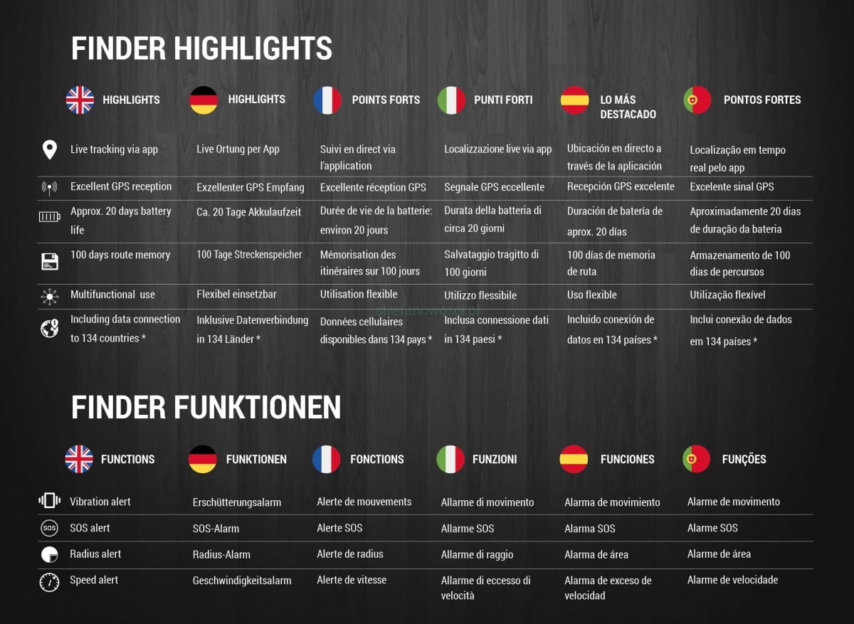 - Bateria wystarcza na około 20 dni z aktywnym czasem śledzenia około 1h / dzień i do 60 dni w trybie gotowości!