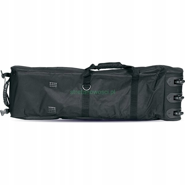 Czarna torba na hulajnogę wykonana z lekkiego i wytrzymałego materiału i wyposażona w system 3 kółek, który umożliwia łatwy transport pojazdu.